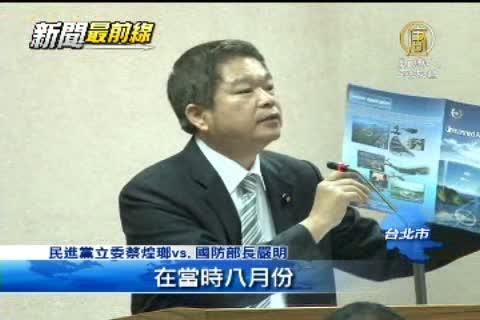 民進黨立委蔡煌瑯vs.國防部長嚴明:「無人載具的飛機,在當時八月份,上個月份參展,結果中共,大陸居然派了北京天合數位科技公司來採購。」「沒有現在沒有這個資訊」「我已經告訴過你這個是採購,這個是採購的洽談,有三家公司保加利亞一家美國一家公司,然後中國大陸北京一家公司(也許他們有來談跟北還沒完成這個手續)他們連談都不能談我告訴你」