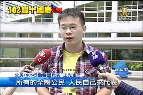 【新唐人亞太台2013年10月4日訊】成功號召25萬人聲援洪仲丘的「公民1985行動聯盟」,將於國慶日當天重返街頭,在立法院旁舉辦「公民升旗」 典禮,聯盟還將提出下修公投、罷免、不分區立委們等主張,要求公民護憲,還政於民。