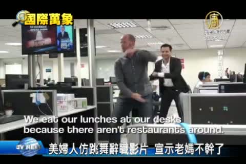 【新唐人亞太台2013年10月11日訊】前壹動畫美籍動畫師席芙琳日前以一支「我不幹了!」(I Quit!)的自拍辭職影片表達對工作的不滿,在YouTube上已吸引超過1500萬的點閱率,在這個熱潮下,在美國,也有一位家庭主婦也想藉著跳舞的方式告訴家人,我不幹了。
