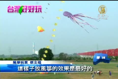 【新唐人亞太台2013年10月14日訊】在慶祝西螺大橋通車六十周年的活動中,特別請來雲嘉地區的風箏玩家,在西螺大橋下的草坪上放風箏,繽紛多彩的各式各樣造型可愛的風箏,有單面的,也有長達一百多公尺的大型風箏。曾經風靡全球的章魚造型和台灣現在正流行的黃色小鴨全都飛上天了,吸引許多大人小孩前來觀賞。