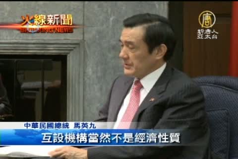 【新唐人亞太台2013年10月18日訊】火線新聞,帶您關注。馬英九總統今天(18日)接見美國「外交政策全國委員會」訪華團,首度表態兩岸互設辦事機構,是政治性質。由於陸委會昨天才表示,兩岸互設辦事機構,因為陸方不答應台灣爭取人道探視,因而進度受阻。在這個時間點上,馬總統將互設辦事處定位為政治性質,引起關注。