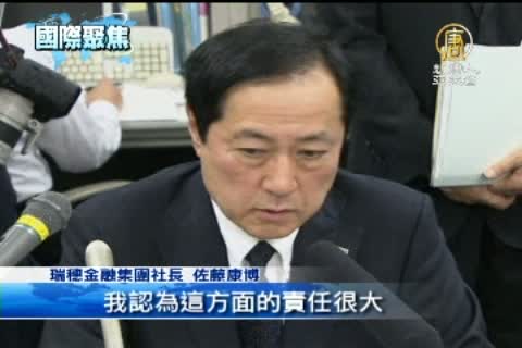 【新唐人亞太台2013年10月29日訊】有如現實版的半澤直樹。日本規模數一數二的銀行瑞穗金融集團,自上月遭踢爆替日本惡名昭彰的黑幫處理數百件貸款,累計放款約200萬美元後,占據日本媒體頭條數週,引發警方追查。日本財務大臣麻生太郎也發出強烈譴責。星期一的記者會上,瑞穗銀行行長公布人事懲處,並對金融廳提出改善計畫。