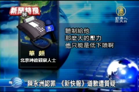 北京時政觀察人士 華頗:「這種環境之下,他們還有別的選擇嗎﹖陳永洲被關押在拘留所裡,他遇到了什麼情況?在那一個封閉環境裡邊,他就可以說是一個任人宰割的羔羊。所以他認罪,是真心還是迫不得已﹖這要劃一個大大的問號。《新快報》道歉那是肯定的,體制給他那麼大的壓力,他只能是低下頭啊。」