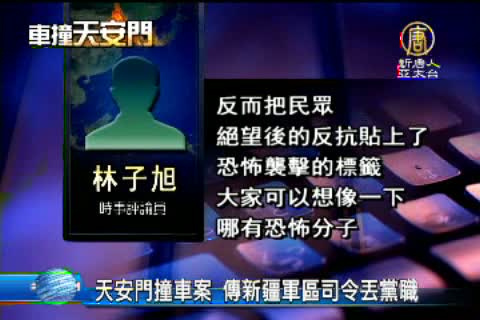 【新唐人亞太台2013年11月6日訊】北京與太原,不到10天內相繼發生爆炸案,造成傷亡,讓中共三中全會籠罩在「星火燎原」的憂慮與陰影中,先前中共新疆機關報《新疆日報》報導,中共中央決定免除新疆軍區司令員彭勇的新疆自治區黨委常委與委員職務,由新疆軍區政委劉雷接替。外界猜測,這可能跟天安門撞車事件有關。另一方面,中共當局下令,今後凡有親屬遭當局「鎮壓」的家庭,都要加強嚴密監控,防止發動類似行為。