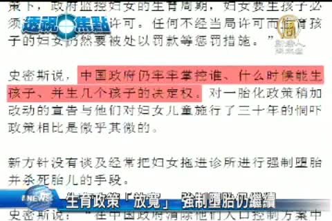 中國青年政治學院教師 楊支柱:「它把這個計劃生育許可制度和強制的措施沒有任何的觸動,只是在這個指標上面稍微放寬了一點。所以這意味著計劃生育侵犯人權的事,會減少一點,但是仍然會大量存在。」