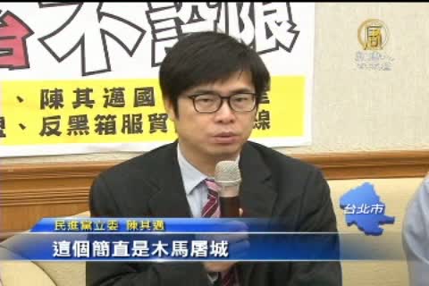 民進黨立委 陳其邁:「第八條,第二項的這種後門條款,這個簡直是木馬屠城,坦白講,我們沒有辦法接受說,馬總統這種,違法,違法,玩法,的這種情況,迴避國會的監督。」