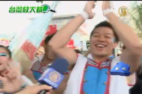 另外還有穿著原住民服飾的團體,卯起勁來往前衝,有的穿著日本和服與武術忍者造型,就是希望讓圍觀民眾投他們一票。