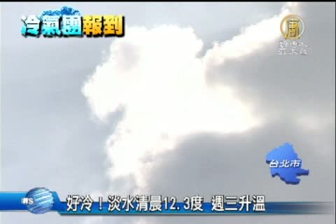 【新唐人亞太台2013年11月19日訊】冷氣團發威,淡水今天清晨創下今年最低溫12.3度,氣象局預估週二到週三清晨氣溫仍偏低,雖然未來冷氣團減弱,各地白天高溫會上升1~2度,但雲量水氣也跟著增加,東半部跟北部將出現短暫降雨,將從乾冷變成濕冷。