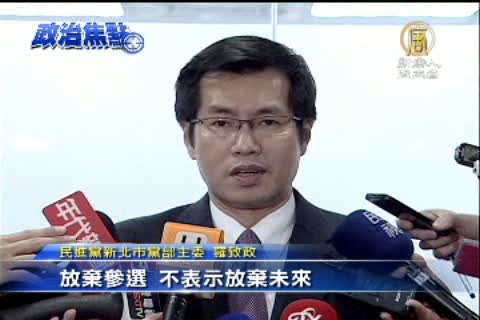 【新唐人亞太台2013年11月19日訊】民進黨新北市長選戰游錫堃、羅致政和莊碩漢三搶一,上禮拜才剛敲定,將在12月2日進行民調,但羅致政今早拜會蔡英文,會後發表聲明表示,他決定退出初選,而且他明白的指出,因為黨中央的規劃,壓縮了他的努力空間。