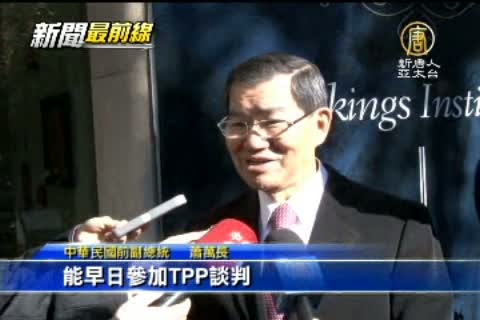 【新唐人亞太台2013年11月21日訊】目前正率團訪問美國的前副總統蕭萬長,20號上午在華府與國會眾議院外委會主席等五位議員進行了會晤,之後在華府智庫布魯金斯學院發表了公開演講,呼籲美國支持台灣加入跨太平洋夥伴協定(TPP),請看本台記者來自華府的報導。