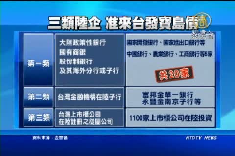 【新唐人亞太台2013年11月27日訊】大陸企業來台發行「寶島債」今天第一天上路,已經有兩家陸銀送件申請,不過大陸企業來台發債卻不需要擔保品,有立委質疑不但風險太高而且讓台灣的資金通通西進、流入大陸,呼籲政府嚴查。