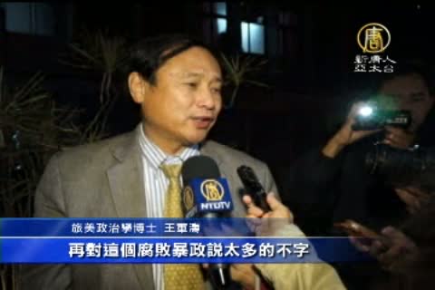 旅美政治學博士 王軍濤:「這種抗議最應該進行的地方,應該在中國大陸,但是因為共產黨,進行一個非常嚴酷的暴政鎮壓,使得這種抗議沒法進行,所以我們應當利用,在自由和民主世界這樣提供的制度空間,對暴政說不,我特別高興台灣的人民能夠在這方面做很多的事情。」