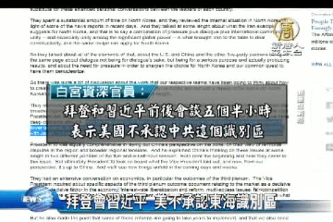 【新唐人亞太台2013年12月5日訊】接下來來關注東海防空識別區議題。昨天,美國副總統拜登抵達北京後,會見中共國家主席習近平及副主席李源潮。白宮資深官員表示,拜登和習近平前後會談了五個半小時,內包括美中關係的各個層面,拜登也詳細地向習近平陳述了美國對東海防空識別區的立場,表示美國不承認這識別區並且深表關切。