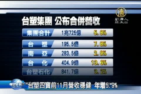 【新唐人亞太台2013年12月6日訊】台灣石化業大廠,台塑集團,今天發布11月的合併營收,集團的四家上市公司前11個月合併營收超過1.72兆,年增5.9%,全年獲利有機會達到千億大關,年終獎金上看4個月。