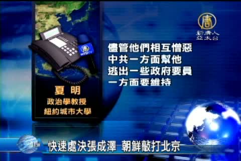 【新唐人亞太台2013年12月14日訊】12號,朝鮮以從事顛覆國家陰謀活動,對朝鮮二號人物張成澤判處死刑,並立即執行。張成澤曾多次訪問中國,是聯繫中﹑朝關係的最重要人物。張成澤落馬後,中共給張成澤的親信提供政治庇護。不過張成澤遭處決後,中共立即通過官媒,呼籲朝鮮一號人物金正恩訪華。有分析認為,金正恩快速殘酷處決張成澤,其中包含了敲打北京的意思。