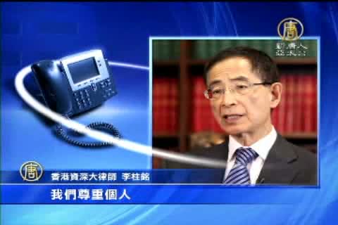 香港資深大律師 李柱銘:「我們尊重個人當然也要尊重身體的每一部份,如果將人的器官沒有得到人家的同意摘取,很明顯是無論在宗教上或是道德上都是不能接受的。」