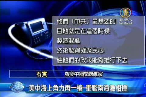 【新唐人亞太台2013年12月16日訊】北京單方面設立「東海防空識別區」之後,中﹑美關係趨向緊張。隨後,美國副總統拜登訪華。但就在拜登訪華期間,中﹑美兩艘軍艦在南中國海的國際海域發生對峙,險些相撞。外界評論,中共的對外擴張和美國的重返亞太戰略本來就不可調和,再加上中共在內外交困之下,恐怕會不惜引發戰爭來維繫政權,因此這類事件很可能還會發生。