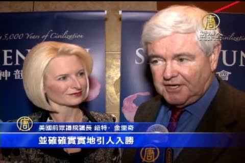 美國前眾議院議長紐特‧金里奇:「到目前為止,觀看神韻非常令人愉悅。她讓成千上萬的人對中華傳統文化有一個更好的理解。卡莉絲塔是一個音樂家,而我不是。她可以比我更好的從不同的角度看到神韻的美。我認為演出非常激動人心,我們的孫女是一個芭蕾舞演員。她真的非常想看今晚的演出。我們每個家庭成員都(在這裡)度過了美好的時光。(神韻)非常非常不同於西方的傳統文化,但他本身是很正統,很系統化的,並確確實實地引人入勝。」