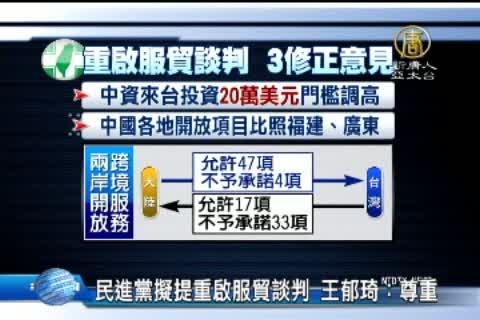 【新唐人亞太台2013年12月31日訊】兩岸服貿協議爭議不斷,民進黨日前發布民調,指有六成以上的台灣民眾要求馬政府,應該與對岸重啟服貿協議談判,民進黨日前提出重啟談判的3項具體修正意見,而服貿協議公聽會審查明年三月初結束。民進黨立委葉宜津表示,黨團將要求行政部門匯整公聽會意見提出總結後,再行審議,也一定會堅持立場,要求重啟談判。對此,陸委會主委王郁琦,表示尊重。