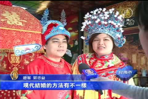 【新唐人亞太台2013年12月31日訊】年底結婚潮湧現,現代新人通常是女生穿婚紗,男方穿西裝坐禮車迎娶,但在台南白河,有家影視城業者,為推廣低碳懷舊婚禮,安排古禮場景與人員配合,要讓新人有不同結婚回憶。