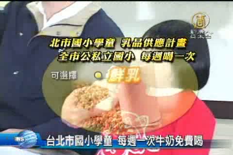 台北市從今年一月開始,提供全市150多所公私立國小學童,每週一次免費喝牛奶,每個人有「鮮乳」、「優酪乳」、或「豆漿」三種選項,目前有十萬八千多名學童參與,2日開始試辦兩個禮拜。