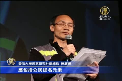 香港大學民意研究計劃總監 鍾庭耀:「行政長官的提名程式不應設篩選機制得到超過九成市民投票支持。行政長官的提名程式應包括公民提名元素投贊成的人士有58487票,占百分之94.1。」