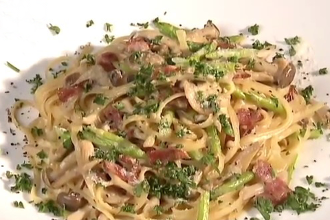 4. 不放油先將培根炒香加蒜末、菇類及蘆筍炒熟。