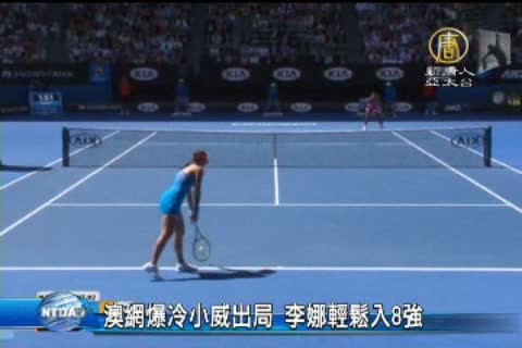 【新唐人亞太台2014年1月20日訊】星期天(19號)網球四大滿貫賽事之一的澳網公開賽再爆冷門,女單第一種子、美國名將小威廉絲,在第4輪賽事中,不敵塞爾維亞選手伊娃諾維,止步16強;另一方面,世界排名第四種子的中國大陸好手李娜則輕鬆挺進女單8強,直衝決賽的機會大幅提升。