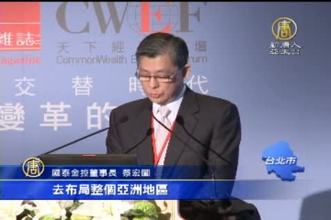 【新唐人亞太台2014年1月22日訊】謝謝吳教授的分析。國泰金控董事長蔡宏圖昨天難得公開演講,蔡宏圖談到國泰金近年的最大變革,就是前進亞洲,展現全球化企圖心。不過,對於投資布局,蔡宏圖認為,台灣的企業,不應該把所有目光集中在中國,可以有更廣泛的規劃。