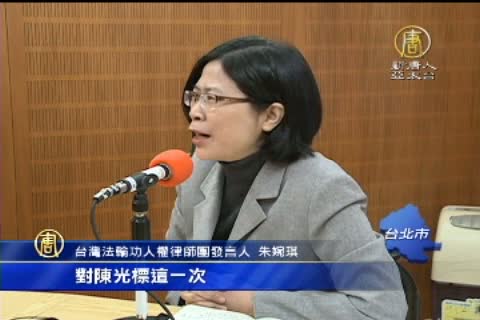 台灣法輪功人權律師團發言人 朱婉琪:「即使是美國的華人媒體,紅色媒體,對陳光標這一次,也沒有什麼報導,所以你可以發現說,他根本沒有市場了,江澤民沒有市場是個定局,習近平應該了解,今天再派誰到國際上,也不會有人支援江澤民了,習近平應該覺得很安穩的,來處理江澤民。」