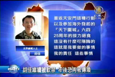 【新唐人亞太台2014年1月29日訊】日前遭中共警方傳喚的北京著名維權人士胡佳,目前已被押回家中繼續軟禁。胡佳向《新唐人》表示,公安已經跟他表明,現在是初步調查,年後他可能還會被帶走。不過,胡佳認為自己做事堂堂正正,符合普世價值,沒什麼可怕的,他也絕不會就此退縮。