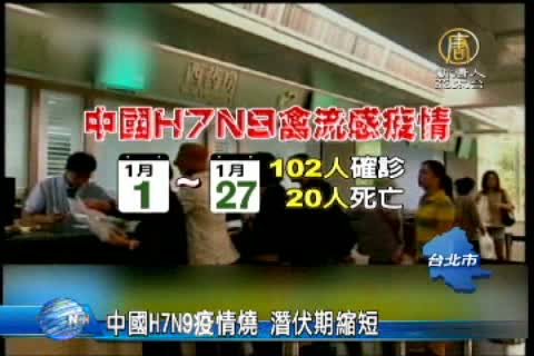 【新唐人亞太台2014年1月29日訊】H7N9禽流感在浙江、廣東和北京等地接連爆出病例,中國從1月以來,已經有102人確診,20人死亡,病毒目前是有限的人傳人,潛伏期也由去年定義的一週縮短至3~4天,正逢年假期間,兩岸民眾來往頻繁,疾管署繃緊神經。
