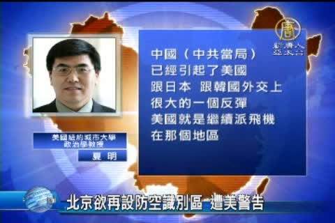 美國紐約城市大學政治學教授 夏明:「中國已經公佈了東海的防空識別區。那麼顯然中國(中共)政府一定會制定南中國海防空識別區。因為這兩個沒有什麼區別,沒有實質性的區別。」