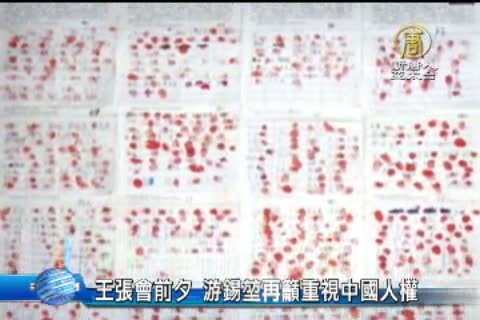 【新唐人亞太台2014年2月9日訊】陸委會主委王郁琦11號即將前往大陸進行訪問,而在這之前,大陸各地傳出,數千民眾按手印,要求當局釋放所有無罪被關押的法輪功學員。前行政院長游錫堃今天(9號)下午出席造勢活動時表示,兩岸交流應首先重視人權議題,中共一意孤行迫害人權,忽視民眾聲音,將自食惡果。