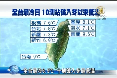 【新唐人亞太台2014年2月11日訊】新聞一開始帶您來看,受到寒流籠罩影響,今天清晨全台急凍!台南以北到宜蘭地區低溫都降到10度以下,其中最冷的地方落在新竹,僅有6.9度;氣象局估計,低溫會持續到周四,提醒民眾做好保暖。