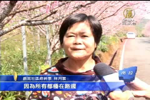 【新唐人亞太台2014年2月12日訊】南投魚池鄉的鹿篙社區,位於海拔700公尺,社區約只有60戶,十幾年前公所為了美化社區,在村內投65線道路上栽植數百棵櫻花,想不到無心插柳卻成蔭,現在道路兩旁的櫻花盛開,成了當地居民賞花的私房景點,也讓前往的遊客驚豔不已。