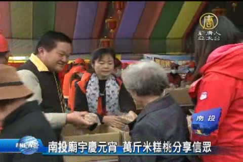【新唐人亞太台2014年2月17日訊】南投名間鄉有一間知名的廟宇,為慶祝元宵,17年來每年都舉辦發送米糕桃吃平安的民俗信仰活動,今年廟方與信眾合力做成達11888台斤米糕桃,吸引2萬民眾來分享,場面熱鬧。