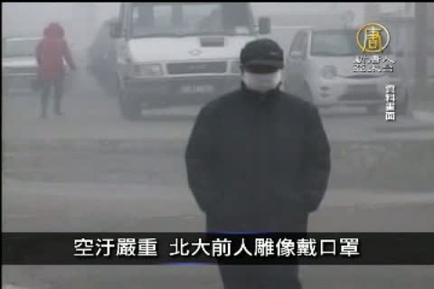 中國大陸多地區進入嚴重霧霾第6天,尤其北京、天津等地更是嚴重,不但路人紛紛戴起口罩,就連北京大學校內的李大釗、蔡元培等前人雕像,也被戴起口罩防空汙。
