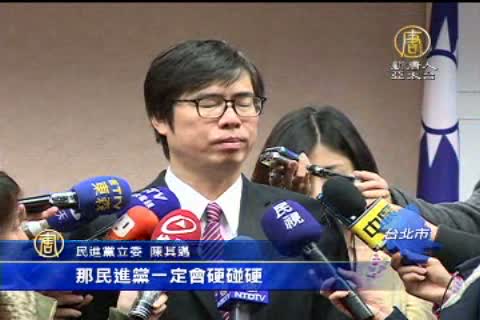 民進黨立委 陳其邁:「立法院是講道理的地方,不是動手動腳的地方,但是國民黨假如動手動腳,黑箱談判在先,多數暴力在後,那民進黨一定會硬碰硬,予以迎頭痛擊。」