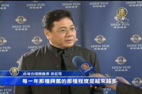 台灣合唱團團長 吳宏璋:「每一年都有不同的感受,而且很奇怪的就是,每一年那種興奮的那種程度是越來越多,越來越大,然後那個感動也越來越深,常常我們很不自覺的就看看看看,眼眶就紅了這樣子。神韻這種中國五千年傳統文化是非常重要的,尤其我們都知道現在中國大陸,它的發展方向是背道而馳的,所以我們更需要這些傳統文化來把她發揚光大」