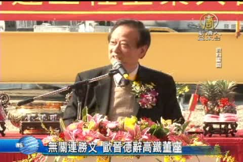 【新唐人亞太台2014年3月6日訊】早安新唐人首先來帶您關心,台灣高鐵董事長歐晉德昨天以傳真方式,辭去高鐵法人董事代表。 台灣高鐵公司董事長歐晉德昨晚辭去董事長職務,理由是最近運轉安全調度及票價調漲對社會造成紛擾,他願承擔責任。台灣高鐵發言人賈先德說明,歐晉德請辭,與歐晉德擔任連勝文競選團隊顧問一事無關, 而且請辭一事考量已久,並非臨時起意。至於台灣高鐵新任董事長的人選,將交由董事會重新選出。
