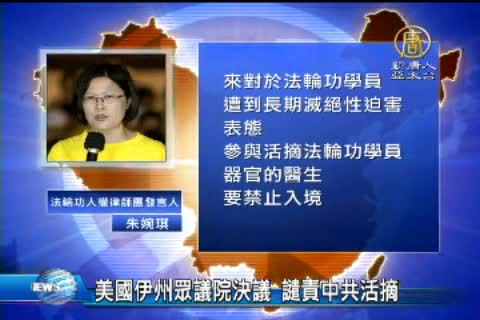 美國伊利諾州眾議院在上個月26號的全體大會上,全票通過了HR0730號決議案,要求中共「立即停止迫害法輪功學員」。這個決議強烈要求美國政府調查中國境內的器官移植,全力制止活摘法輪功學員器官暴行,並要求美國政府禁止任何參與過使用法輪功學員器官進行移植的醫生進入美國。