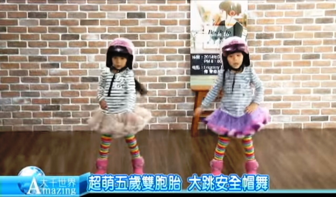 【新唐人亞太台 2014 年 03 月 11 日訊】2014跨年晚會,謝金燕帶上超大安全帽跳舞的畫面,想必大家都不陌生,有一對五歲雙胞胎姊妹,同樣跳起安全帽舞,默契十足的表演畫面,看過的網友直呼超萌超可愛,影片上傳網路,點擊率已經突破40萬。