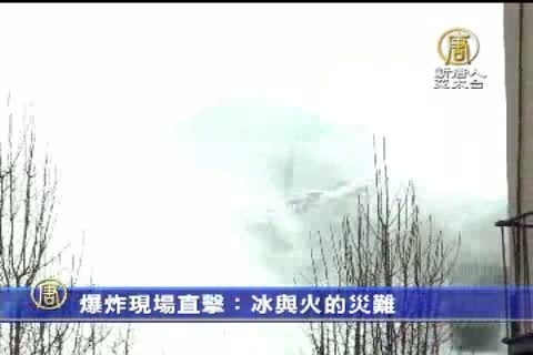 記者:昨天上午九點半發生的瓦斯泄露爆炸事故,已經過去24個小時以上了。現場搜救工作仍在繼續。在我身後大家可以看到消防員們仍在全力的滅火,滾滾的濃煙隨著今天的強風四處飄散。昨天晚上氣溫驟降,使已經被水淋過的現場結上了厚厚的冰。