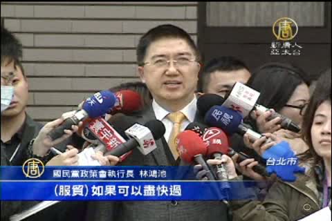 【新唐人亞太台2014年3月14日訊】立法院服貿協議大戰,戰火持續延燒,立法院長王金平,上午召集朝野協商,最後還是宣告破局,朝野政黨也隔空互嗆,國民黨團主張前天的議事程序有瑕疵,下禮拜國民黨團排案審查服貿,非常合情合理,不過民進黨也不甘示弱,指責國民黨知法犯法,揚言如果國民黨堅持排案,下星期的立法院絕對是烽火連天。