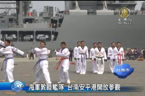 【新唐人亞太台2014年3月18日訊】海軍敦睦艦隊今天(18號)駛進台南安平商港,開放民眾參觀,雖然今天不是假日,但海軍官校鼓號樂隊、海軍儀隊及海軍陸戰隊莒拳隊精采的表演,還是吸引不少民眾到場爭相合影。