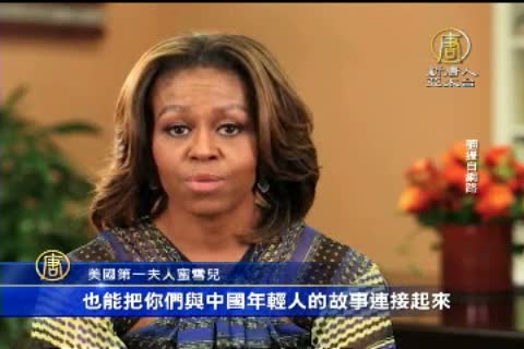 美國第一夫人蜜雪兒(Michelle Obama):「(中文)您好!……這種訪問機會很重要,它不僅能讓我與像你們這樣的年輕人分享中國悠久的歷史和文化,也能把你們與中國年輕人的故事連接起來。」
