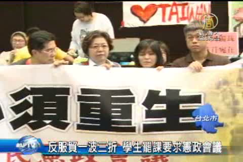 在全台學子串聯罷課之際,20多名教授,進入議場相挺,拉開橫幅,呼籲民主必須重生,支持召開公民憲政會議,他們批評,政府極力想與北京簽服貿協議,現在的總統兼黨主席,掌握立法及行政權,已是台灣重大的憲政危機。