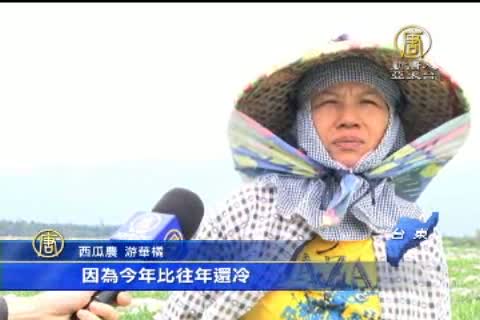 【新唐人亞太台2014年3月24日訊】台東的西瓜原本應該要上市了,但因為今年氣候比往年濕冷,所以成長緩慢,導致成熟期延後,現在必須等到四月中旬才能收成,農民成本增加不少,叫苦連天。