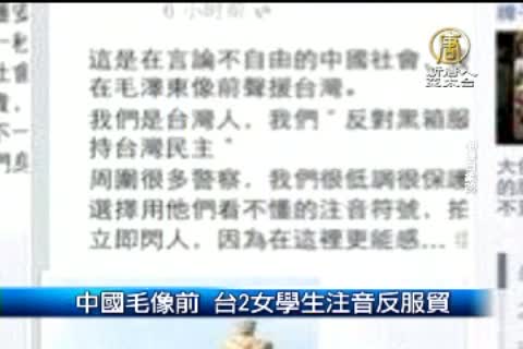 2名在中國就學的台灣女學生,日前在毛澤東像前,以注音方式寫下「反對黑箱服貿,支持台灣民主,愛台灣。」她們在臉書上說,周圍有很多警察,因此選擇用大陸人看不懂的注音符號,低調拍完後立刻閃人,並強調「在這裡更能感受到大陸社會的潛規則,因為這樣更能了解民主的可貴。」